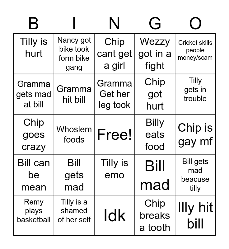 This bingo card has a free space and 24 words: Bill gets mad, Tilly is a shamed of her self, Gramma Get her leg took, Remy plays basketball, Cricket skills people money/scam, Tilly is hurt, Gramma gets mad at bill, Nancy got bike took form bike gang, Billy eats food, Tilly is emo, Chip got hurt, Chip goes crazy, Bill mad, Bill gets mad beacuse tilly, Gramma hit bill, Chip breaks a tooth, Chip is gay mf, Chip cant get a girl, Tilly gets in trouble, Whoslem foods, Illy hit bill, Bill can be mean, Wezzy got in a fight and Idk.