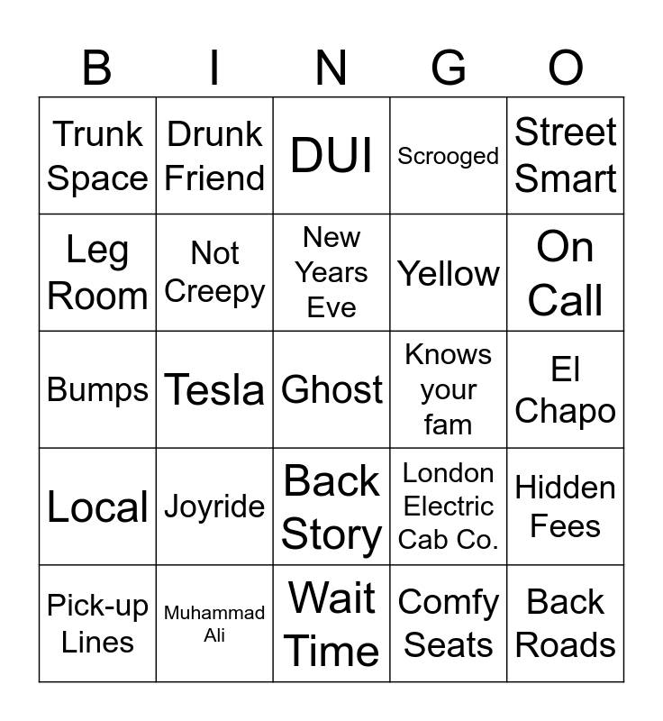 This bingo card has 32 words: Comfy Seats, XL, Tesla, Smells Good, Local, Not Creepy, Street Smart, Hidden Fees, Drunk Friend, Back Roads, New Years Eve, DUI, Smokes Bud, Conversation, Knows your fam, Back Ally, Pick-up Lines, Bumps, Back Story, Joyride, London Electric Cab Co., Yellow Taxi Cab, El Chapo, Muhammad Ali, Ghost, Scrooged, Yellow, Leg Room, Trunk Space, Wait Time, Seat Belts and On Call.