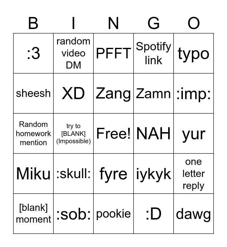 This bingo card has a free space and 24 words: :skull:, :sob:, Zang, [blank] moment, typo, :3, sheesh, random video DM, NAH, fyre, Zamn, Random homework mention, iykyk, one letter reply, XD, :D, yur, PFFT, :imp:, try to [BLANK] (Impossible), dawg, Miku, Spotify link and pookie.
