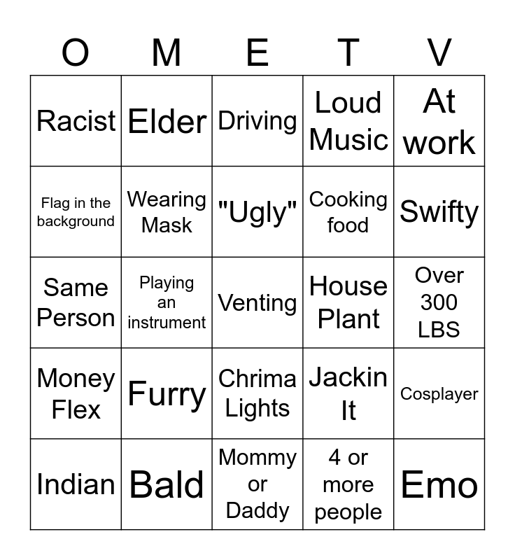 This bingo card has a free space and 24 words: Furry, Bald, "Ugly", Indian, At work, Racist, Flag in the background, Elder, House Plant, Chrima Lights, Cooking food, Same Person, Jackin It, Cosplayer, Wearing Mask, 4 or more people, Over 300 LBS, Driving, Swifty, Playing an instrument, Emo, Money Flex, Loud Music and Mommy or Daddy.