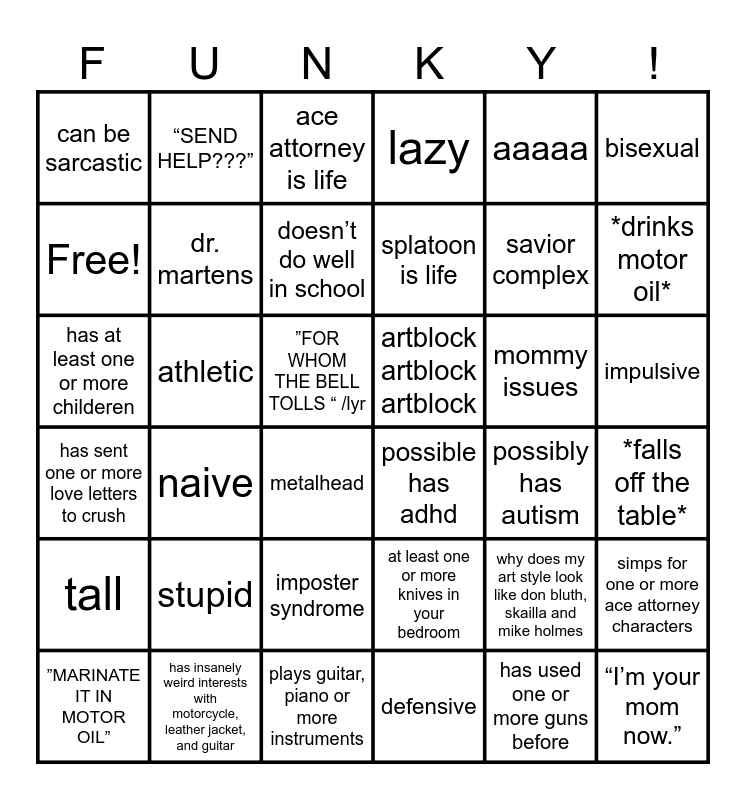 This bingo card has 36 words: has sent one or more love letters to crush, naive, plays guitar, piano or more instruments, splatoon is life, mommy issues, impulsive, can be sarcastic, has insanely weird interests with motorcycle, leather jacket, and guitar, ace attorney is life, at least one or more knives in your bedroom, savior complex, bisexual, tall, athletic, doesn’t do well in school, lazy, why does my art style look like don bluth, skailla and mike holmes, *falls off the table*, Free!, dr. martens, metalhead, possible has adhd, possibly has autism, simps for one or more ace attorney characters, has at least one or more childeren, “SEND HELP???”, ”FOR WHOM THE BELL TOLLS “ /lyr, defensive, aaaaa, *drinks motor oil*, ”MARINATE IT IN MOTOR OIL”, stupid, imposter syndrome, artblock artblock artblock, has used one or more guns before and “I’m your mom now.”.