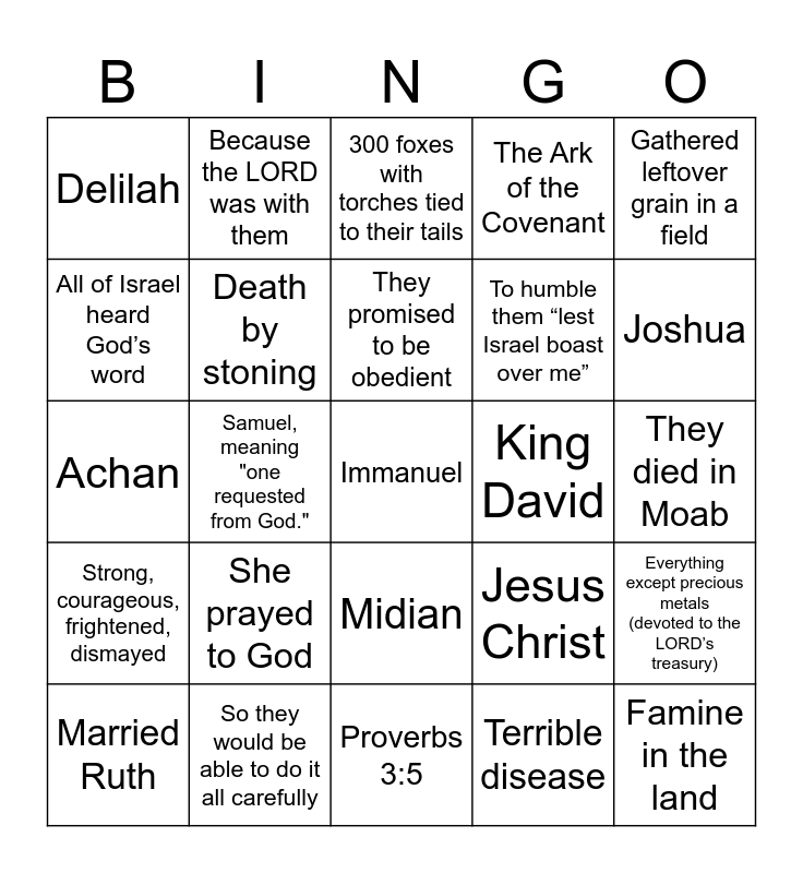 This bingo card has 50 words: Israel’s Defeat at AI, Immanuel, The Trumpet (Ram’s Horn), Proverbs 3:5, She prayed to God, He gave her a son, Because the LORD was with them, A Lion, All of Israel heard God’s word, 7 Days, Death by stoning, The Ark of the Covenant, Everything except precious metals (devoted to the LORD’s treasury), Jesus Christ, Shout with a great shout, Boaz's field., They promised to be obedient, King David, Wages, Eternal life, Gathered leftover grain in a field, Samuel, meaning "one requested from God.", Terrible disease, Delilah, To humble them “lest Israel boast over me”, A swarm of bees and honey, Famine in the land, Joshua, No, Israel did not, 300 foxes with torches tied to their tails, Midian, No, God is Sovereign, Adam and Eve after the Fall, A prophet of the Lord, Jesus, the Messiah, So they would be able to do it all carefully, A Nazirite Vow, Ruth, God with us, Kingdom, Righteousness, They died in Moab, She was unable to have children, No, the weakest, Rahab & her family as promised, A Cloak, Silver, & Bar of Gold, Married Ruth, Achan, Nun, The Philistines captured it, Strong, courageous, frightened, dismayed and Only 300 Men.