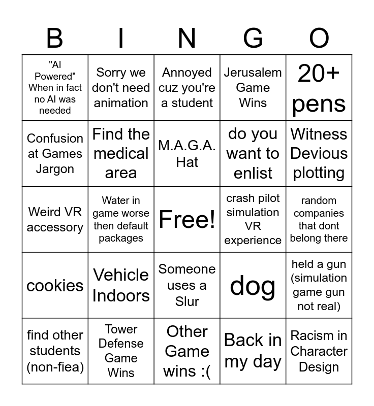 This bingo card has a free space and 28 words: held a gun (simulation game gun not real), were not hiring, do you want to enlist, Back in my day, Confusion at Games Jargon, Annoyed cuz you're a student, Sorry we don't need animation, cookies, crash pilot simulation VR experience, find other students (non-fiea), Weird VR accessory, Jerusalem Game Wins, Tower Defense Game Wins, Other Game wins :(, Witness Devious plotting, Muscle contest (push ups, pull ups, etc), Vehicle Indoors, Find the medical area, M.A.G.A. Hat, Someone uses a Slur, "AI Powered" When in fact no AI was needed, Game looks like its from 00s, Racism in Character Design, Water in game worse then default packages, random companies that dont belong there, dog, 20+ pens and yo yo.