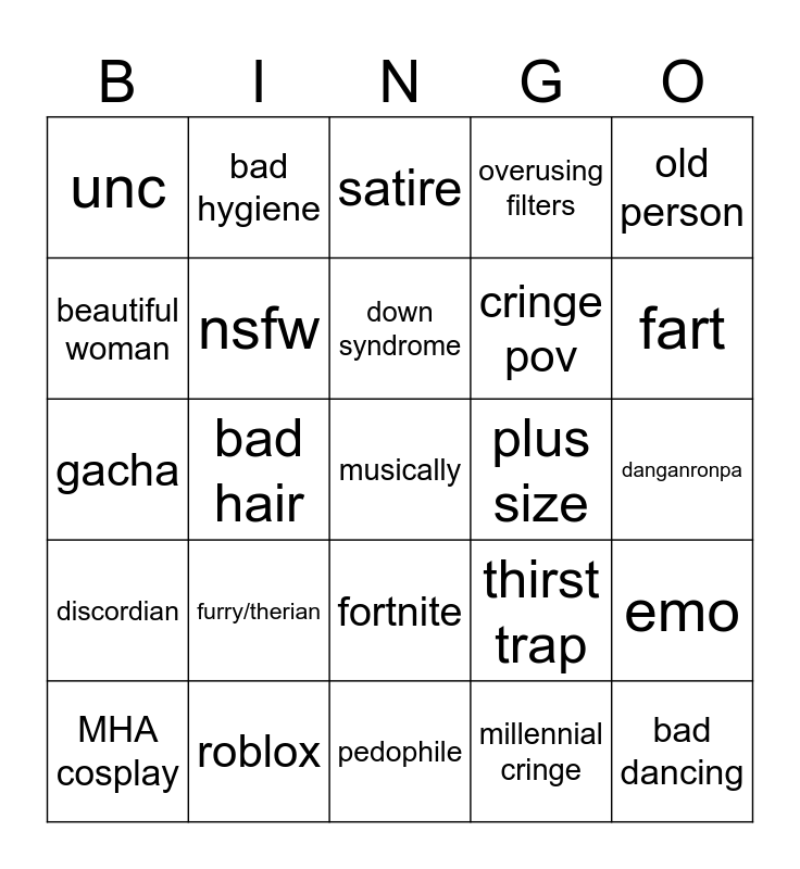 This bingo card has a free space and 24 words: MHA cosplay, furry/therian, down syndrome, millennial cringe, old person, unc, bad hygiene, satire, plus size, danganronpa, gacha, nsfw, thirst trap, emo, beautiful woman, roblox, pedophile, overusing filters, fart, discordian, bad hair, fortnite, cringe pov and bad dancing.