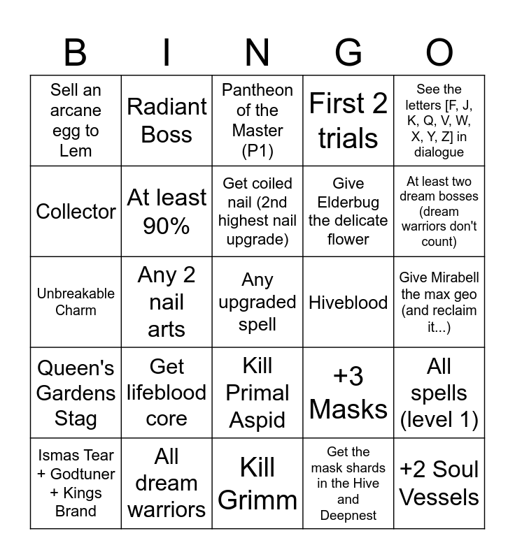 This bingo card has 27 words: +3 Masks, +2 Soul Vessels, Give Elderbug the delicate flower, Kill Grimm, Collector, Pantheon of the Master (P1), Radiant Boss, Queen's Gardens Stag, Hiveblood, All spells (level 1), Unbreakable Charm, First 2 trials, Ismas Tear + Godtuner + Kings Brand, All dream warriors, At least two dream bosses (dream warriors don't count), Any dreamer, At least 90%, Get coiled nail (2nd highest nail upgrade), Get lifeblood core, Sell an arcane egg to Lem, Give Mirabell the max geo (and reclaim it...), Get the mask shards in the Hive and Deepnest, Any 2 nail arts, Any upgraded spell, Kill Primal Aspid, See the letters [F, J, K, Q, V, W, X, Y, Z] in dialogue and Get 8000 geo.