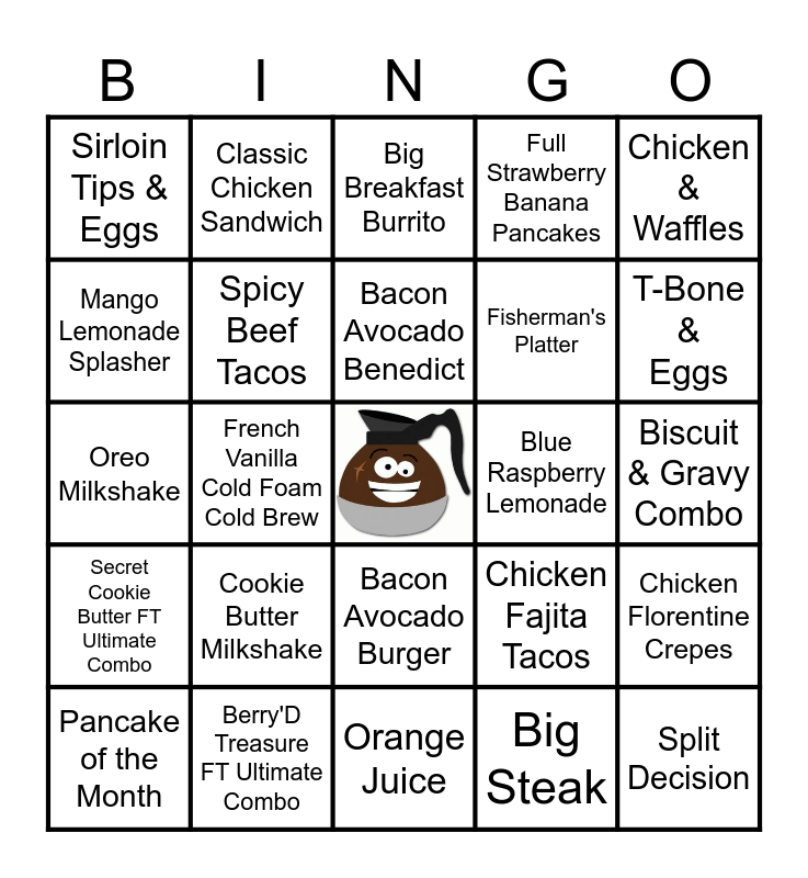 This bingo card has a free space and 24 words: Cookie Butter Milkshake, Berry'D Treasure FT Ultimate Combo, Bacon Avocado Benedict, Pancake of the Month, Chicken & Waffles, Sirloin Tips & Eggs, Mango Lemonade Splasher, Classic Chicken Sandwich, Blue Raspberry Lemonade, Bacon Avocado Burger, Fisherman's Platter, Oreo Milkshake, Chicken Fajita Tacos, Chicken Florentine Crepes, Spicy Beef Tacos, Big Steak, Biscuit & Gravy Combo, Big Breakfast Burrito, T-Bone & Eggs, French Vanilla Cold Foam Cold Brew, Split Decision, Secret Cookie Butter FT Ultimate Combo, Full Strawberry Banana Pancakes and Orange Juice.