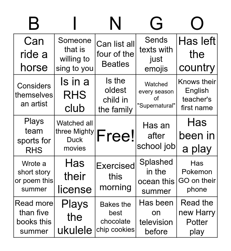 This bingo card has a free space and 24 words: Has their license, Plays the ukulele, Is the oldest child in the family, Read more than five books this summer, Has left the country, Can ride a horse, Considers themselves an artist, Someone that is willing to sing to you, Has an after school job, Exercised this morning, Watched every season of "Supernatural", Plays team sports for RHS, Splashed in the ocean this summer, Has Pokemon GO on their phone, Is in a RHS club, Has been on television before, Has been in a play, Can list all four of the Beatles, Knows their English teacher's first name, Watched all three Mighty Duck movies, Read the new Harry Potter play, Wrote a short story or poem this summer, Sends texts with just emojis and Bakes the best chocolate chip cookies.