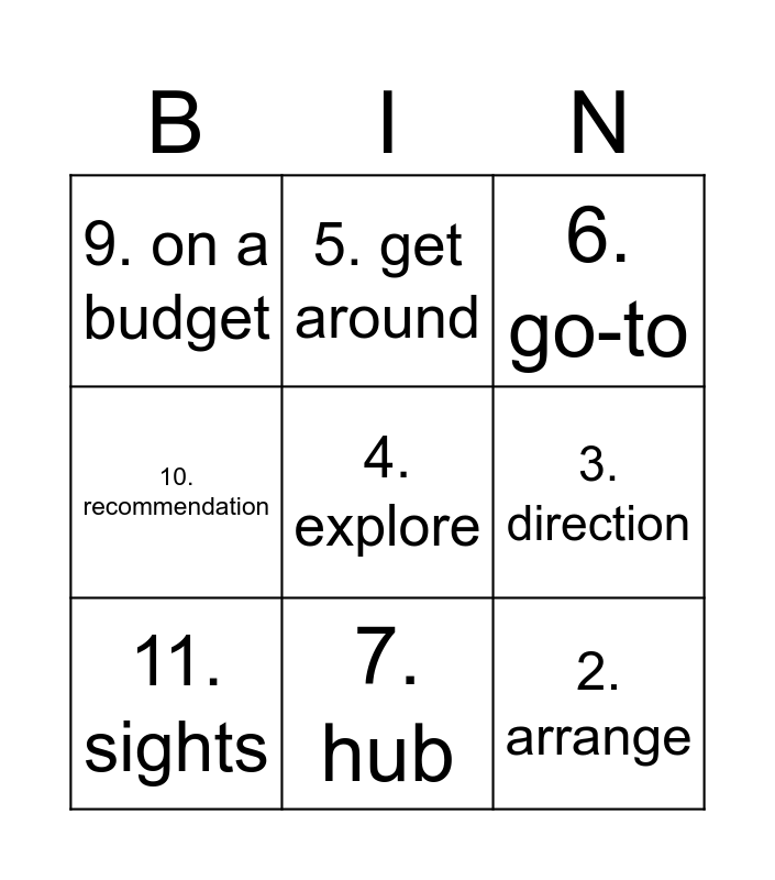 This bingo card has a free space and 12 words: Free!, 1. accommodation, 2. arrange, 3. direction, 5. get around, 6. go-to, 7. hub, 8. location, 9. on a budget, 10. recommendation, 11. sights and 12. unlimited.