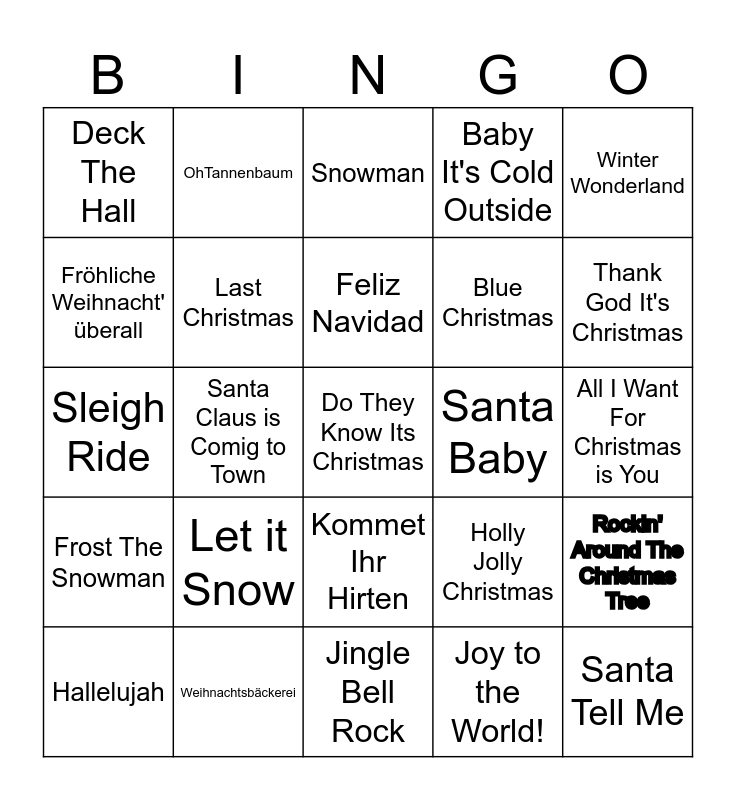 This bingo card has 25 words: Let it Snow, Jingle Bell Rock, Feliz Navidad, Hallelujah, Winter Wonderland, Deck The Hall, Fröhliche Weihnacht' überall, OhTannenbaum, Santa Baby, Kommet Ihr Hirten, Blue Christmas, Sleigh Ride, Holly Jolly Christmas, Rockin' Around The Christmas Tree, Last Christmas, Santa Tell Me, All I Want For Christmas is You, Snowman, Thank God It's Christmas, Santa Claus is Comig to Town, Do They Know Its Christmas, Weihnachtsbäckerei, Frost The Snowman, Baby It's Cold Outside and Joy to the World!.