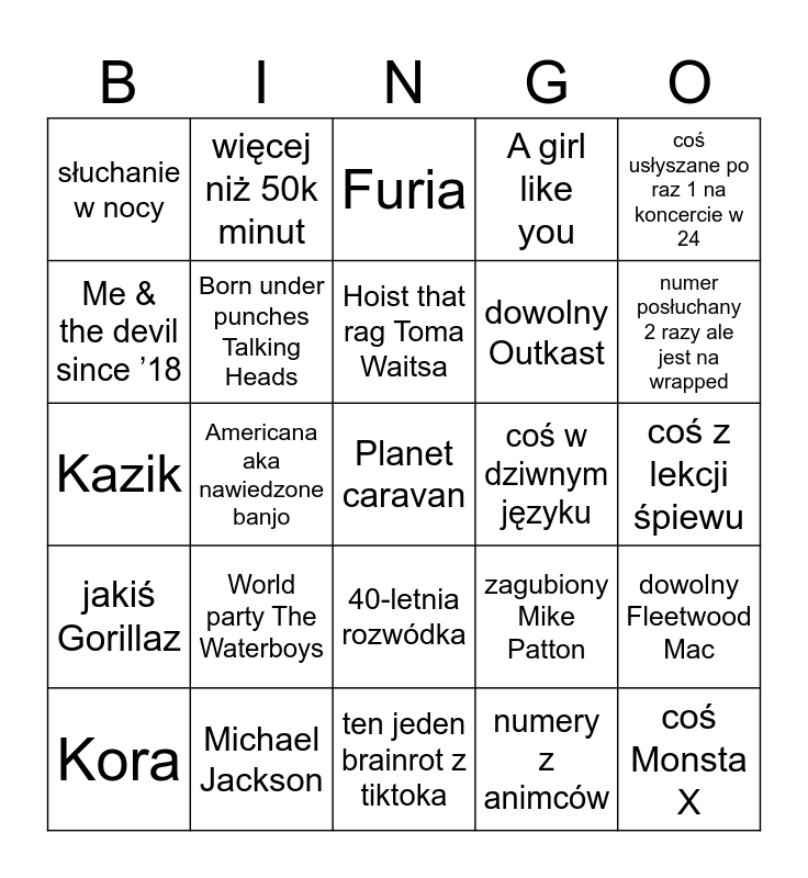 This bingo card has a free space and 24 words: World party The Waterboys, Michael Jackson, Hoist that rag Toma Waitsa, Kora, coś usłyszane po raz 1 na koncercie w 24, słuchanie w nocy, Me & the devil since ’18, więcej niż 50k minut, coś w dziwnym języku, 40-letnia rozwódka, dowolny Outkast, Kazik, zagubiony Mike Patton, dowolny Fleetwood Mac, Born under punches Talking Heads, numery z animców, coś z lekcji śpiewu, Furia, numer posłuchany 2 razy ale jest na wrapped, Americana aka nawiedzone banjo, coś Monsta X, jakiś Gorillaz, A girl like you and ten jeden brainrot z tiktoka.