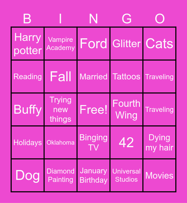 This bingo card has a free space and 24 words: Oklahoma, Diamond Painting, Married, Dog, Cats, Harry potter, Reading, Vampire Academy, Fourth Wing, Binging TV, Tattoos, Buffy, 42, Dying my hair, Fall, Universal Studios, Traveling, Ford, Traveling, Trying new things, Movies, Holidays, Glitter and January Birthday.
