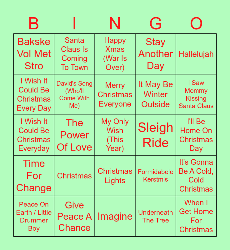 This bingo card has 99 words: Free!, All I Want For Christmas Is You, Last Christmas, Happy Xmas (War Is Over), Do They Know It's Christmas, Driving Home For Christmas, Wonderful Christmas Time, 2000 Miles, Merry Christmas Everybody, Thank God It's Christmas, Please Come Home For Christmas, Stop The Cavalry, Once Upon A Long Ago, Christmas Lights, Christmas (Baby Please Come Home), Bakske Vol Met Stro, Santa Claus Is Coming To Town, Santa Baby, Christmas Time, Shake Up Christmas, The Message Is Love, Feliz Navidad, We Are The World, It's Beginning To Look A Lot Like Christmas, Fairytale Of New York, It's Gonna Be A Cold, Cold Christmas, Merry Christmas Everyone, Step Into Christmas, White Christmas, Christmas Through Your Eyes, Imagine, Underneath The Tree, Ding Dong, Rockin' Around The Christmas Tree, The Power Of Love, I Wish It Could Be Christmas Everyday, Lonely This Christmas, December Will Be Magic Again, Christmas Time, Christmas, Put A Little Love In Your Heart, I Saw Mommy Kissing Santa Claus, Stay Another Day, Give Peace A Chance, Why Couldn't It Be Christmas Every Day, De Eerste Sneeuw, All Alone On Christmas, The Most Wonderful Time Of The Year, Holly Jolly Christmas, My Sweet Lord, I Wish Everyday Could Be Like Christmas, My Only Wish (This Year), Formidabele Kerstmis, Baby It's Cold Outside, Merry Christmas Baby, Let It Snow, Santa Tell Me, We All Stand Together, Earth Song, 2000 Miles, Santa's Coming For Us, Rudolph The Red Nosed Reindeer, When The Thames Froze, Cold As Christmas, Christmas (Baby Please Come Home), Hallelujah, A Winter's Tale, Santa Claus Is Coming To Town, Wonderful Dream (Holidays Are Coming), Time For Change, Let It Go, It May Be Winter Outside, I Wish It Could Be Christmas Every Day, Spread A Little Happiness, Christmas Without You, Cozy Little Christmas, David's Song (Who'll Come With Me), Santa Claus Is Coming To Town, What The World Needs Now Is Love, Have Yourself A Merry Little Christmas, Sleigh Ride, Wintersong, Mistletoe, Winter Wonderland, Mull Of Kintyre, Rudolph The Red Nosed Reindeer, What Christmas Means To Me, Someday At Christmas, I'll Be Home On Christmas Day, Peace On Earth / Little Drummer Boy, Dear Santa (Bring Me A Man This Christmas), White Christmas, When I Get Home For Christmas, 8 Days Of Christmas, Christmas Was A Friend Of Mine, Sleigh Ride, Heal The World, It's The Most Wonderful Time Of The Year and Santa Claus Is Coming To Town.