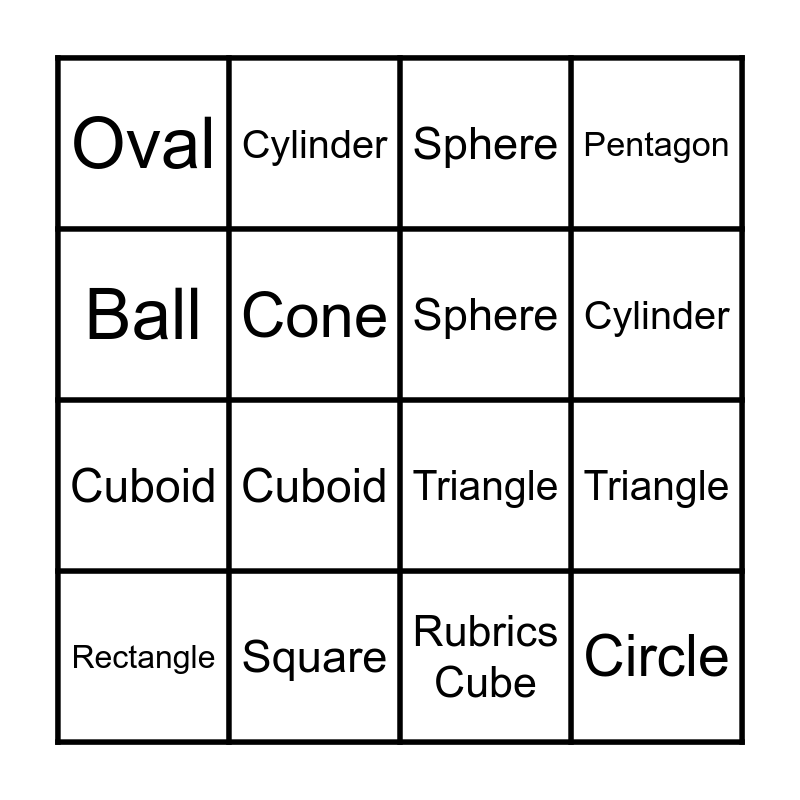 ⚠ This card has duplicate items: Cube (2), Cuboid (2), Pyramid (2), Cone (2), Sphere (2), Cylinder (2), Circle (2), Square (2), Rectangle (2), Triangle (2)