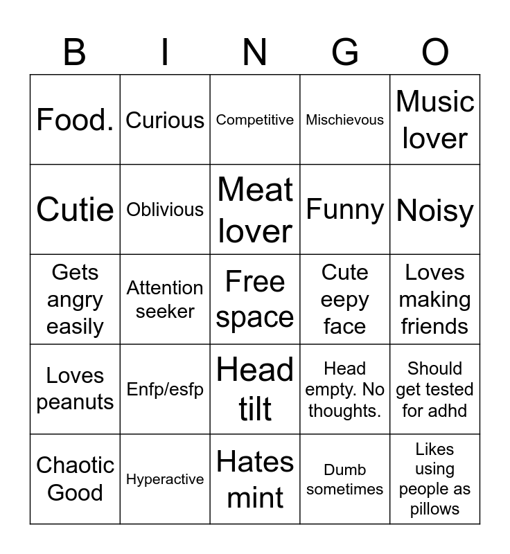 This bingo card has a free space and 24 words: Enfp/esfp, Hyperactive, Meat lover, Chaotic Good, Music lover, Food., Cutie, Curious, Cute eepy face, Head tilt, Funny, Gets angry easily, Head empty. No thoughts., Should get tested for adhd, Oblivious, Dumb sometimes, Loves making friends, Competitive, Noisy, Attention seeker, Likes using people as pillows, Loves peanuts, Mischievous and Hates mint.