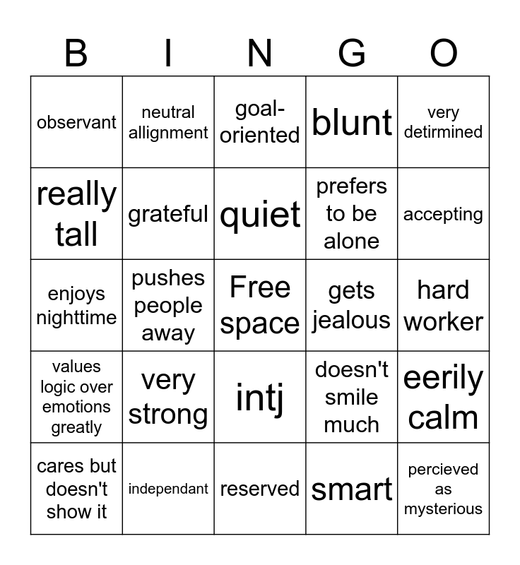 This bingo card has a free space and 24 words: very strong, independant, quiet, cares but doesn't show it, very detirmined, observant, really tall, neutral allignment, gets jealous, intj, prefers to be alone, enjoys nighttime, doesn't smile much, eerily calm, grateful, smart, hard worker, goal-oriented, accepting, pushes people away, percieved as mysterious, values logic over emotions greatly, blunt and reserved.