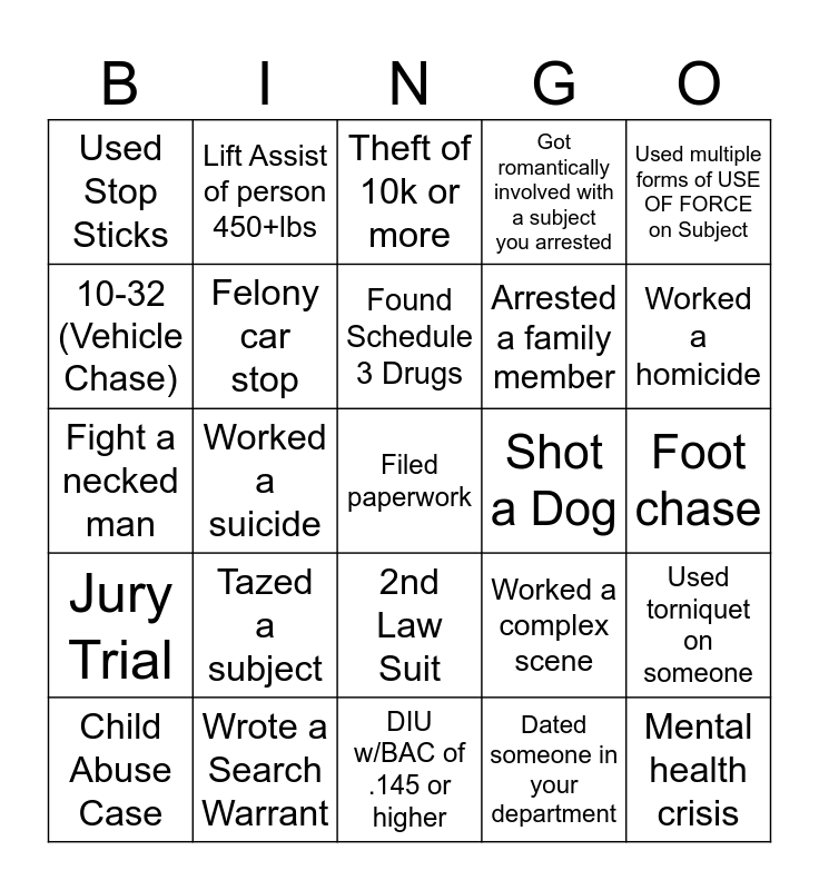 This bingo card has 25 words: Tazed a subject, DIU w/BAC of .145 or higher, Found Schedule 3 Drugs, Child Abuse Case, Used multiple forms of USE OF FORCE on Subject, Used Stop Sticks, 10-32 (Vehicle Chase), Lift Assist of person 450+lbs, Shot a Dog, 2nd Law Suit, Arrested a family member, Fight a necked man, Worked a complex scene, Used torniquet on someone, Felony car stop, Mental health crisis, Foot chase, Theft of 10k or more, Worked a homicide, Worked a suicide, Filed paperwork, Wrote a Search Warrant, Jury Trial, Got romantically involved with a subject you arrested and Dated someone in your department.