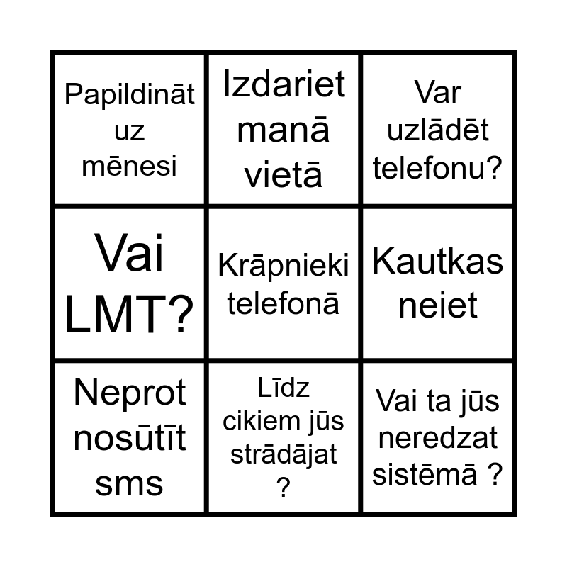 This bingo card has a free space and 8 words: Vai LMT?, Izdariet manā vietā, Kautkas neiet, Neprot nosūtīt sms, Var uzlādēt telefonu?, Papildināt uz mēnesi, Līdz cikiem jūs strādājat ? and Vai ta jūs neredzat sistēmā ?.