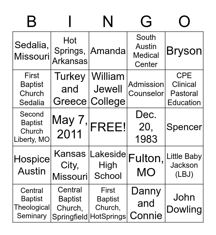 This bingo card has a free space and 24 words: Kansas City, Missouri, Central Baptist Church, Springfield, William Jewell College, Central Baptist Theological Seminary, Bryson, Sedalia, Missouri, First Baptist Church Sedalia, Hot Springs, Arkansas, Dec. 20, 1983, Lakeside High School, Admission Counselor, Second Baptist Church Liberty, MO, Fulton, MO, Little Baby Jackson (LBJ), Turkey and Greece, Danny and Connie, Spencer, Amanda, CPE Clinical Pastoral Education, May 7, 2011, John Dowling, Hospice Austin, South Austin Medical Center and First Baptist Church, HotSprings.