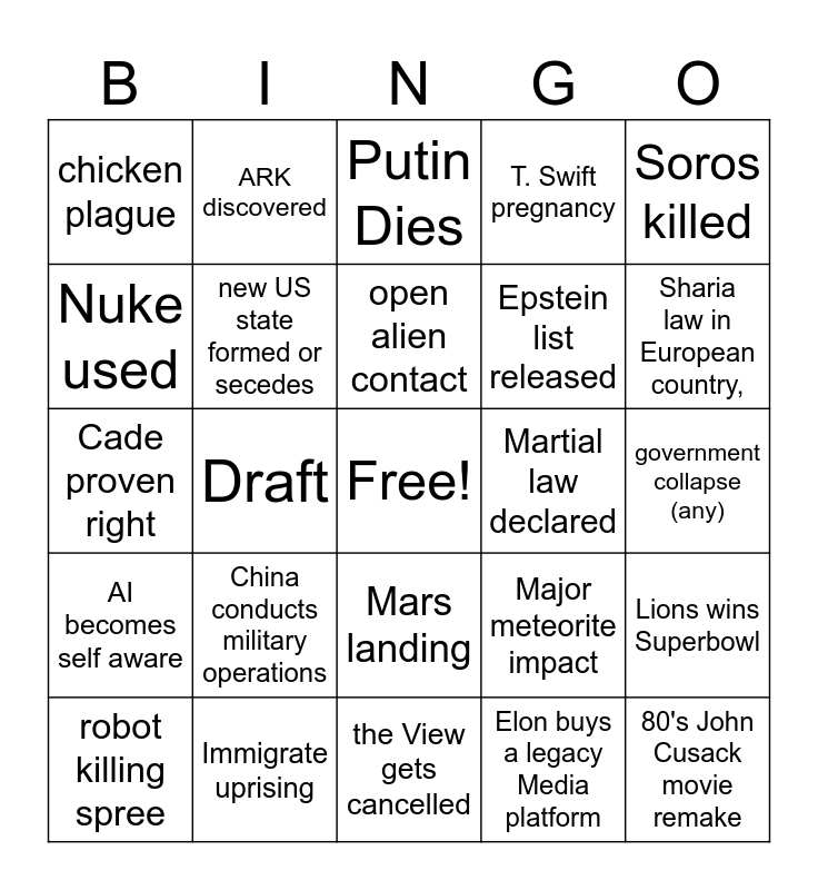 This bingo card has a free space and 24 words: China conducts military operations, Immigrate uprising, open alien contact, robot killing spree, Soros killed, chicken plague, Nuke used, ARK discovered, Martial law declared, Mars landing, Epstein list released, Cade proven right, Major meteorite impact, Lions wins Superbowl, new US state formed or secedes, Elon buys a legacy Media platform, government collapse (any), Putin Dies, Sharia law in European country,, Draft, 80's John Cusack movie remake, AI becomes self aware, T. Swift pregnancy and the View gets cancelled.