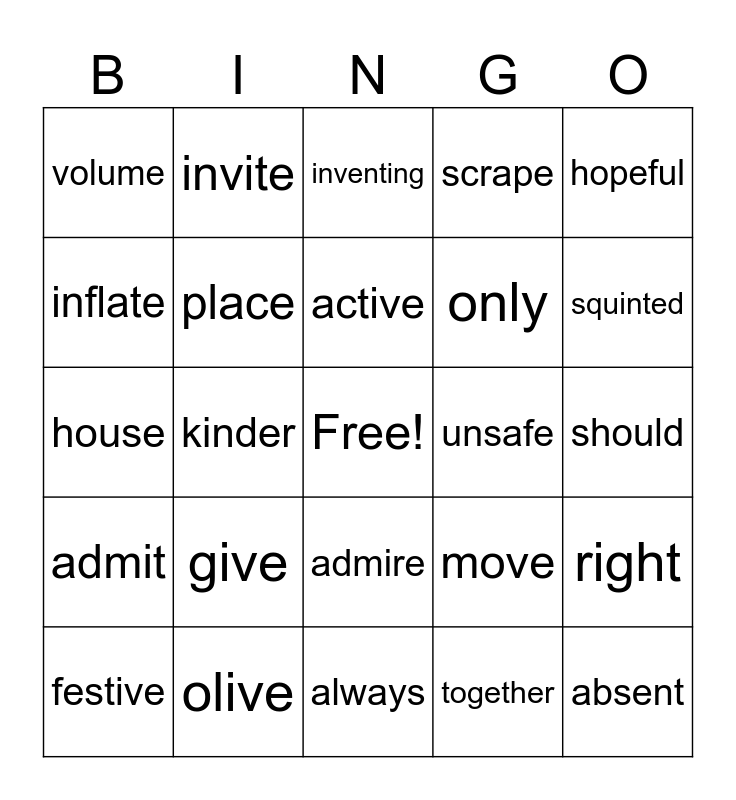 This bingo card has a free space and 24 words: give, olive, active, festive, hopeful, volume, inflate, invite, unsafe, admire, only, house, move, right, place, together, should, inventing, squinted, kinder, absent, admit, scrape and always.