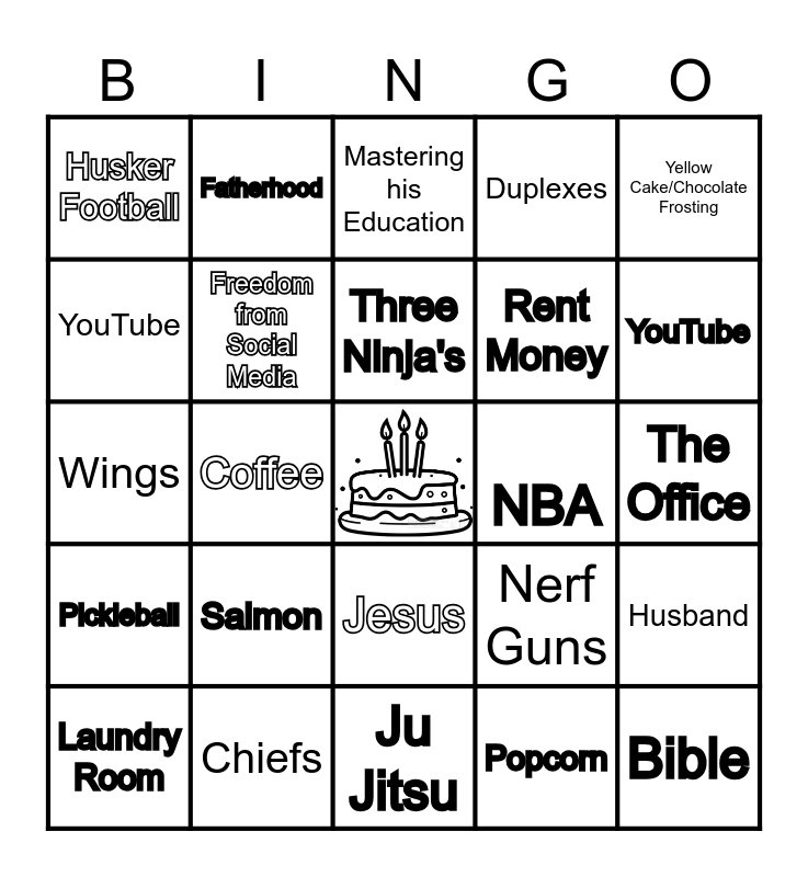 This bingo card has a free space and 29 words: Laundry Room, Bible, Coffee, Malachi, Husker Football, Mastering his Education, Freedom from Social Media, Salmon, NBA, Chiefs, The Office, Bible, Ju Jitsu, Popcorn, YouTube, Family, Jesus, Pickleball, Yellow Cake/Chocolate Frosting, Wings, Nerf Guns, Traveling, Rent Money, YouTube, Duplexes, Fatherhood, Husband, Three Ninja's and Sport's Center.