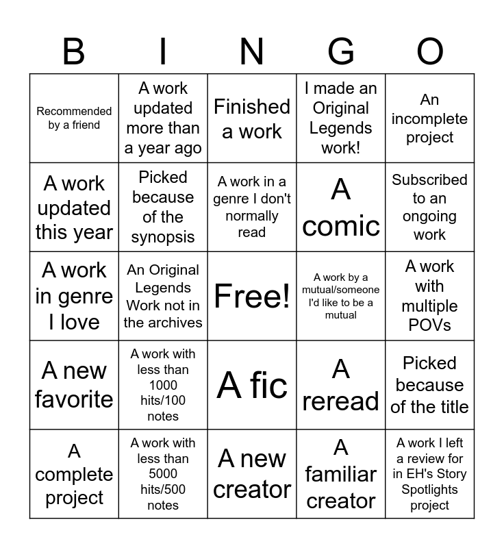 This bingo card has a free space and 24 words: A work with less than 1000 hits/100 notes, A work with less than 5000 hits/500 notes, A work in a genre I don't normally read, A complete project, An incomplete project, Recommended by a friend, A work updated this year, A work updated more than a year ago, A work by a mutual/someone I'd like to be a mutual, A fic, A comic, A work in genre I love, A reread, Picked because of the title, Picked because of the synopsis, A familiar creator, A work with multiple POVs, Finished a work, Subscribed to an ongoing work, An Original Legends Work not in the archives, A work I left a review for in EH's Story Spotlights project, A new favorite, I made an Original Legends work! and A new creator.