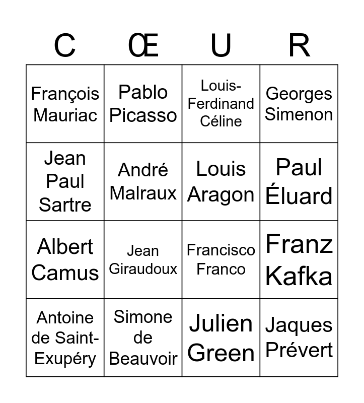 This bingo card has 16 words: Simone de Beauvoir, Franz Kafka, Louis-Ferdinand Céline, François Mauriac, Albert Camus, Pablo Picasso, Francisco Franco, Julien Green, Jean Paul Sartre, André Malraux, Antoine de Saint-Exupéry, Georges Simenon, Jean Giraudoux, Paul Éluard, Louis Aragon and Jaques Prévert.