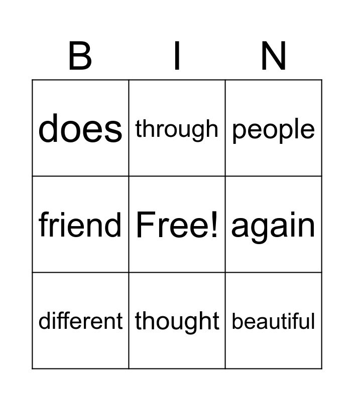 This bingo card has a free space and 9 words: different, people, through, friend, does, again, beautiful, because and thought.