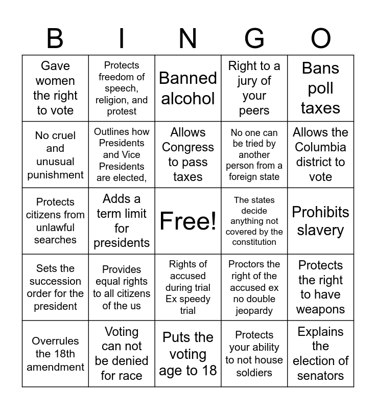 This bingo card has a free space and 24 words: Provides equal rights to all citizens of the us, Voting can not be denied for race, Allows Congress to pass taxes, Overrules the 18th amendment, Bans poll taxes, Gave women the right to vote, No cruel and unusual punishment, Protects freedom of speech, religion, and protest, The states decide anything not covered by the constitution, Rights of accused during trial Ex speedy trial, No one can be tried by another person from a foreign state, Protects citizens from unlawful searches, Proctors the right of the accused ex no double jeopardy, Protects the right to have weapons, Outlines how Presidents and Vice Presidents are elected,, Protects your ability to not house soldiers, Prohibits slavery, Banned alcohol, Allows the Columbia district to vote, Adds a term limit for presidents, Explains the election of senators, Sets the succession order for the president, Right to a jury of your peers and Puts the voting age to 18.