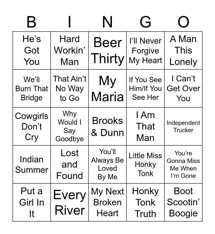 This bingo card has a free space and 50 words: Brand New Man, Boot Scootin’ Boogie, Neon Moon, My Next Broken Heart, Lost and Found, Cheatin’ On the Blues, Hard Workin’ Man, Rock My World (Little Country Girl), We’ll Burn That Bridge, She Used to Be Mine, That Ain’t No Way to Go, I’ll Never Forgive My Heart, You’re Gonna Miss Me When I’m Gone, Little Miss Honky Tonk, She’s Not the Cheatin’ Kind, Whiskey Under the Bridge, My Maria, I Am That Man, Mama Don’t Get Dressed Up for Nothing, A Man This Lonely, Why Would I Say Goodbye, Honky Tonk Truth, He’s Got You, If You See Him/If You See Her, How Long Gone, Husbands and Wives, I Can’t Get Over You, South of Santa Fe, Beer Thirty, You’ll Always Be Loved By Me, Ain’t Nothing ‘Bout You, Only in America, The Long Goodbye, My Heart is Lost To You, Every River, Red Dirt Road, You Can’t Take the Honky Tonk Out of the Girl, That’s What She Gets for Loving Me, That’s What It’s All About, Independent Trucker, Play Something Country, Hillbilly Deluxe, Believe, Building Bridges, Put a Girl In It, Cowgirls Don’t Cry, Johnny Cash Junkie (Buck Owens Freak), God Must Be Busy, Indian Summer and Honky Tonk Stomp.