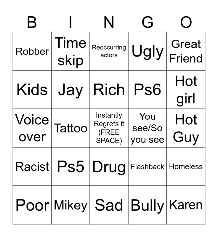 This bingo card has a free space and 24 words: Ps5, Mikey, Rich, Poor, Great Friend, Robber, Kids, Time skip, You see/So you see, Drug, Ps6, Voice over, Flashback, Homeless, Jay, Bully, Hot Guy, Reoccurring actors, Hot girl, Tattoo, Karen, Racist, Ugly and Sad.