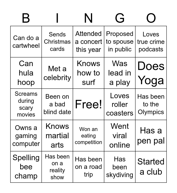 This bingo card has a free space and 36 words: Knows how to read tarot, Knows ASL, Appeared in a movie, Met a celebrity, Went viral online, Owns a gaming computer, Knows how to surf, Has an unusual family tradition, Loves true crime podcasts, Likes pineapple on pizza, Been on a bad blind date, Proposed to spouse in public, Been to Disney this year, Loves roller coasters, Does Yoga, Can do a cartwheel, Rides horses, Knows martial arts, Started a club, Attended a concert this year, Has been to the Olympics, Has a pen pal, Has been on a reality show, Spelling bee champ, Has been on a road trip, Sends Christmas cards, Screams during scary movies, Loves karaoke, Was lead in a play, Can hula hoop, Can bench press 150+ lbs, Good at escape rooms, Has been skydiving, Won an eating competition, Wearing funny socks and Won at a casino.