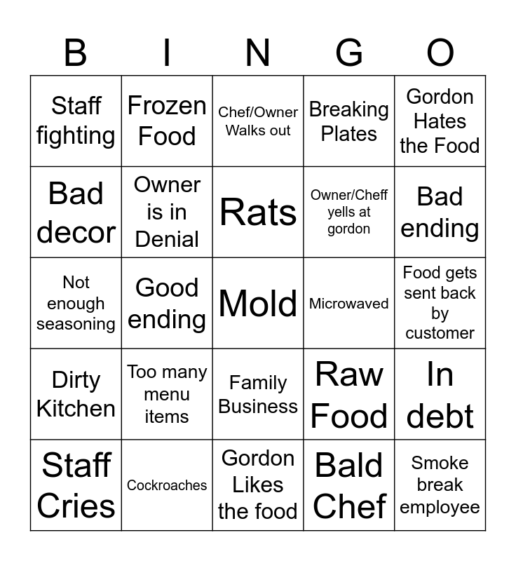 This bingo card has a free space and 24 words: Too many menu items, Cockroaches, Rats, Staff Cries, Gordon Hates the Food, Staff fighting, Bad decor, Frozen Food, Microwaved, Family Business, Owner/Cheff yells at gordon, Not enough seasoning, Raw Food, In debt, Owner is in Denial, Bald Chef, Food gets sent back by customer, Chef/Owner Walks out, Bad ending, Good ending, Smoke break employee, Dirty Kitchen, Breaking Plates and Gordon Likes the food.