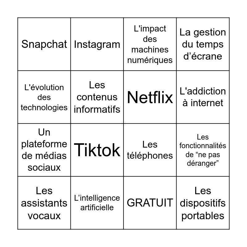 This bingo card has 16 words: L’intelligence artificielle, Les fonctionnalités de “ne pas déranger”, L'impact des machines numériques, Snapchat, Un plateforme de médias sociaux, Instagram, Les téléphones, GRATUIT, L'évolution des technologies, Les contenus informatifs, Les assistants vocaux, La gestion du temps d’écrane, Tiktok, L'addiction à internet, Netflix and Les dispositifs portables.