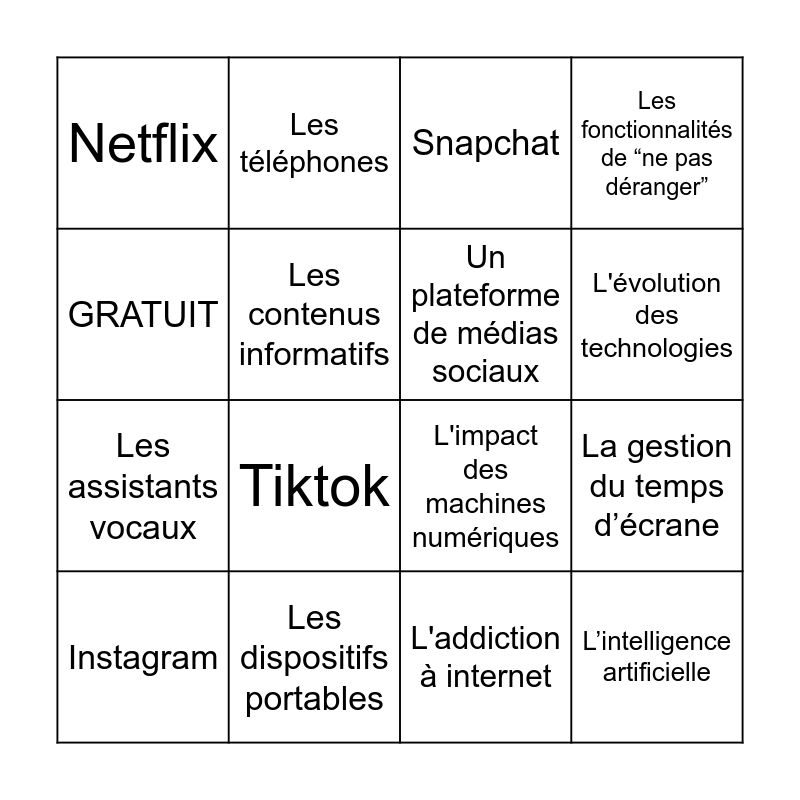 This bingo card has 16 words: Les dispositifs portables, La gestion du temps d’écrane, Snapchat, Netflix, Les assistants vocaux, Les téléphones, L'impact des machines numériques, L'addiction à internet, GRATUIT, Les contenus informatifs, Instagram, Les fonctionnalités de “ne pas déranger”, Tiktok, L'évolution des technologies, Un plateforme de médias sociaux and L’intelligence artificielle.
