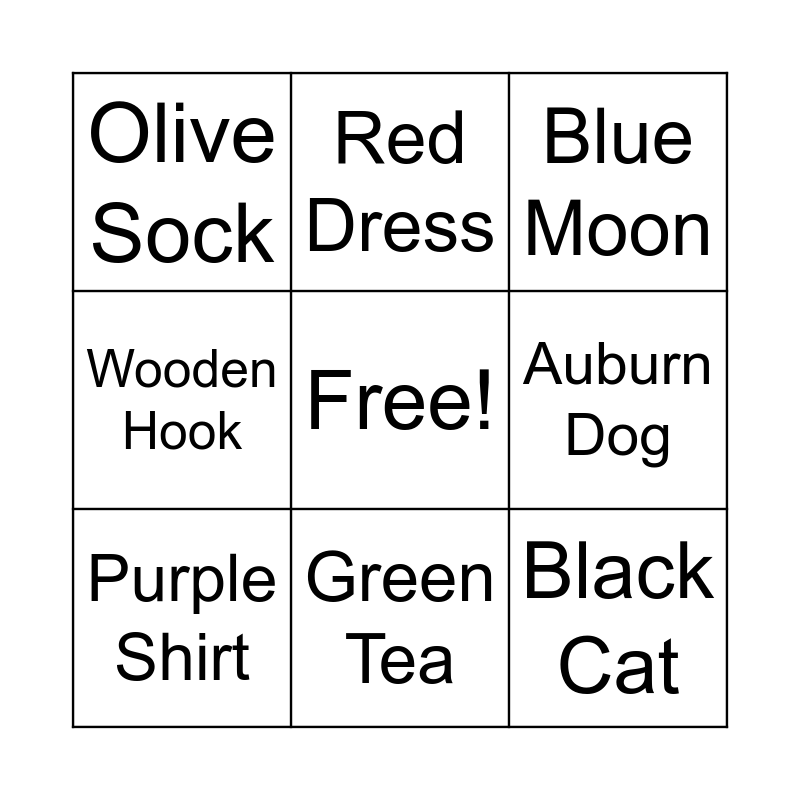 This bingo card has a free space and 8 words: Auburn Dog, Blue Moon, Red Dress, Purple Shirt, Olive Sock, Black Cat, Wooden Hook and Green Tea.