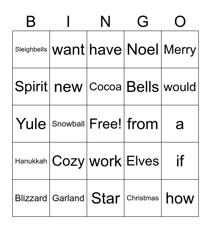 This bingo card has a free space and 200 words: Joy, Cheer, Snow, Gifts, Lights, Santa, Reindeer, Mistletoe, Holly, Bells, Wreath, Tree, Ornaments, Stockings, Fireplace, Cookies, Candy, Gingerbread, Carols, Sleigh, Frost, Icicles, Eggnog, Festive, Garland, Tinsel, Wrapping, Ribbon, Elves, Chimney, Northpole, Blizzard, Snowman, Icicles, Nutcracker, Poinsettia, Candles, Peace, Family, Friends, Warmth, Cozy, Tradition, Celebration, Giving, Receiving, Holiday, Season, Festivities, Jolly, Merry, Noel, Yule, Hanukkah, Kwanzaa, Christmas, Solstice, Advent, Nativity, Feast, Party, Gathering, Reunion, Midnight, Eve, Tradition, Blessings, Menorah, Grateful, Dreidel, Charity, Generosity, Spirit, Magic, Wonder, Miracle, Star, Angel, Shepherd, Bethlehem, Sleighbells, Frosty, Rudolph, Scarf, Mittens, Cocoa, Fireplace, Hearth, Snowflake, Blizzard, Icicle, Sledding, Skating, Skiing, Snowball, Frostbite, Cozy, Warmth, Blanket, Fireplace, the, be, to, of, and, a, in, that, have, I, it, for, not, on, with, he, as, you, do, at, this, but, his, by, from, they, we, say, her, she, or, an, will, my, one, all, would, there, their, what, so, up, out, if, about, who, get, which, go, me, when, make, can, like, time, no, just, him, know, take, people, into, year, your, good, some, could, them, see, other, than, then, now, look, only, come, its, over, think, also, back, after, use, two, how, our, work, first, well, way, even, new, want, because, any, these, give, day, most and us.