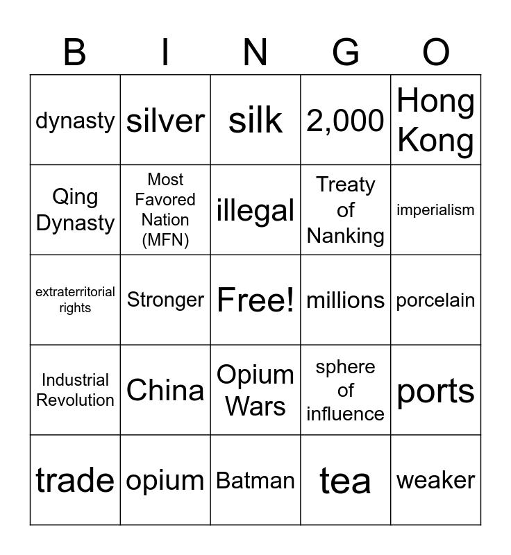 This bingo card has a free space and 24 words: China, opium, illegal, trade, Hong Kong, dynasty, Qing Dynasty, silver, millions, Opium Wars, Treaty of Nanking, extraterritorial rights, sphere of influence, ports, Most Favored Nation (MFN), tea, porcelain, silk, imperialism, Stronger, weaker, Industrial Revolution, 2,000 and Batman.