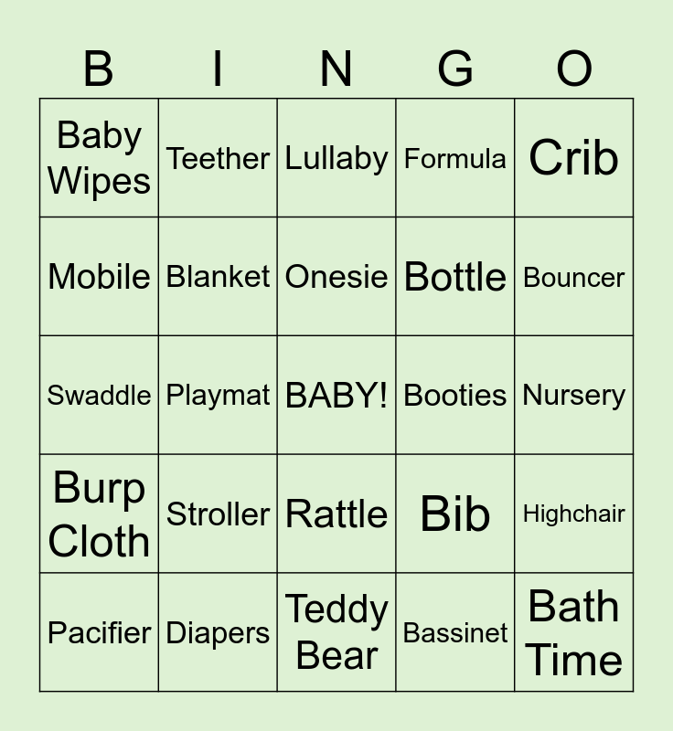 This bingo card has a free space and 24 words: Stroller, Diapers, Onesie, Pacifier, Crib, Baby Wipes, Mobile, Teether, Booties, Rattle, Bottle, Swaddle, Bib, Highchair, Blanket, Bassinet, Nursery, Lullaby, Bouncer, Playmat, Bath Time, Burp Cloth, Formula and Teddy Bear.