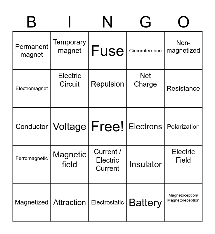 This bingo card has a free space and 24 words: Magnetic field, Attraction, Repulsion, Magnetized, Non- magnetized, Permanent magnet, Electromagnet, Temporary magnet, Electrons, Current / Electric Current, Net Charge, Conductor, Insulator, Electric Field, Electric Circuit, Battery, Polarization, Fuse, Resistance, Voltage, Magnetoception/ Magnetoreception, Ferromagnetic, Circumference and Electrostatic.
