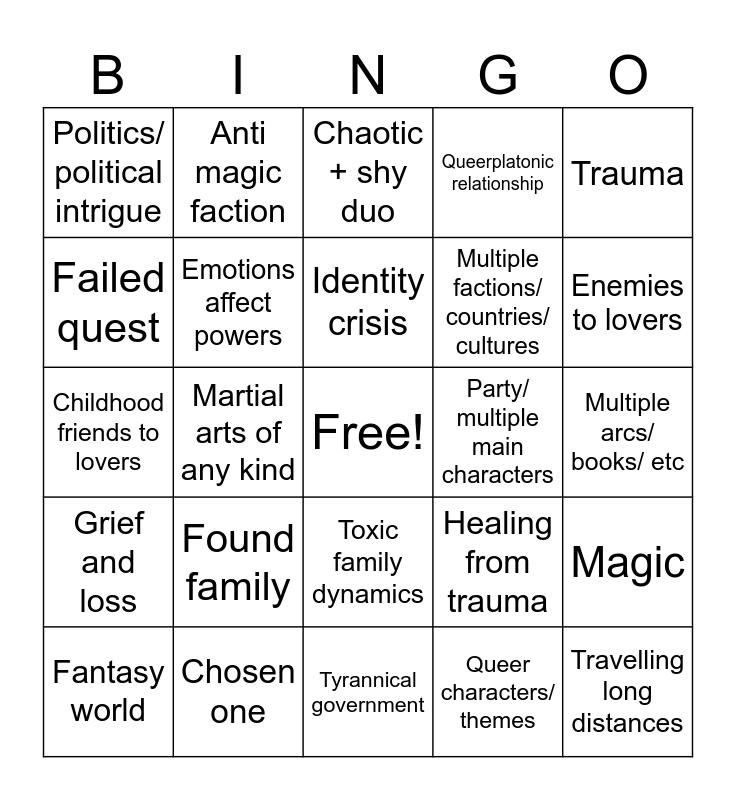 This bingo card has a free space and 24 words: Found family, Chosen one, Identity crisis, Fantasy world, Trauma, Politics/ political intrigue, Failed quest, Anti magic faction, Party/ multiple main characters, Toxic family dynamics, Multiple factions/ countries/ cultures, Childhood friends to lovers, Healing from trauma, Magic, Emotions affect powers, Queer characters/ themes, Multiple arcs/ books/ etc, Chaotic + shy duo, Enemies to lovers, Martial arts of any kind, Travelling long distances, Grief and loss, Queerplatonic relationship and Tyrannical government.