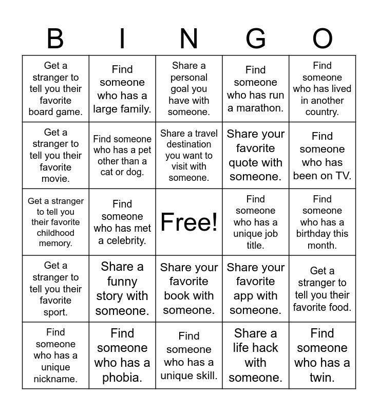 This bingo card has a free space and 35 words: Find someone who has a unique hobby., Share a fun fact about yourself with a stranger., Get someone to teach you a phrase in another language., Find someone who has a pet other than a cat or dog., Share your favorite book with someone., Find someone who has run a marathon., Get a stranger to tell you their favorite movie., Find someone who has a hidden talent., Share a travel destination you want to visit with someone., Find someone who has a tattoo., Get a stranger to tell you their favorite childhood memory., Find someone who has lived in another country., Share your favorite podcast with someone., Find someone who has a collection (stamps, coins, etc.)., Get a stranger to tell you their favorite board game., Find someone who has a unique job title., Share a life hack with someone., Find someone who has met a celebrity., Get a stranger to tell you their favorite sport., Find someone who has a twin., Share your favorite app with someone., Find someone who has a unique nickname., Get a stranger to tell you their favorite food., Find someone who has a phobia., Share a personal goal you have with someone., Find someone who has been on TV., Get a stranger to tell you their favorite season., Find someone who has a unique accent., Share your favorite quote with someone., Find someone who has a birthday this month., Get a stranger to tell you their favorite animal., Find someone who has a unique skill., Share a funny story with someone., Find someone who has a large family. and Get a stranger to tell you their favorite place to relax..