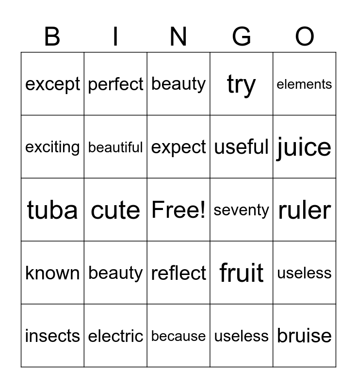 This bingo card has a free space and 24 words: beauty, electric, expect, insects, elements, except, exciting, perfect, seventy, reflect, useful, tuba, fruit, useless, beautiful, useless, ruler, beauty, juice, cute, bruise, known, try and because.