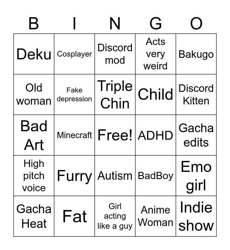 This bingo card has a free space and 24 words: Furry, Fat, Triple Chin, Gacha Heat, Bakugo, Deku, Old woman, Cosplayer, ADHD, Autism, Child, Bad Art, BadBoy, Emo girl, Fake depression, Anime Woman, Gacha edits, Discord mod, Discord Kitten, Minecraft, Indie show, High pitch voice, Acts very weird and Girl acting like a guy.