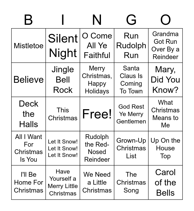 This bingo card has a free space and 60 words: Jingle Bells, Have Yourself a Merry Little Christmas, White Christmas, All I Want For Christmas Is You, The Christmas Song, Rockin' Around The Christmas Tree, Jingle Bell Rock, The Little Drummer Boy, Santa Claus Is Coming To Town, You're A Mean One, Mr. Grinch, Run Rudolph Run, Wonderful Christmastime, Believe, Blue Christmas, Christmas Time Is Here, Mistletoe, Carol of the Bells, Grandma Got Run Over By a Reindeer, Baby, It's Cold Outside, Merry Christmas, Happy Holidays, God Rest Ye Merry Gentlemen, O Come All Ye Faithful, I'll Be Home For Christmas, Up On the House Top, Twelve Days of Christmas, Hark! The Herald Angels Sing, Sleigh Ride, Winter Wonderland, Mary, Did You Know?, Dance of the Sugar Plum Fairy, It's the Most Wonderful Time of the Year, I Saw Mommy Kissing Santa Claus, Santa Tell Me, Santa Baby, Silent Night, O Come, O Come, Emmanuel, O Holy Night, This Christmas, Go Tell It On the Mountain, Deck the Halls, Away In A Manger, Let It Snow! Let It Snow! Let It Snow!, What Christmas Means to Me, It's Beginning to Look a Lot Like Christmas, Grown-Up Christmas List, Here Comes Santa Claus, Where Are You Christmas, Do You Hear What I Hear>, Joyful, Joyful We Adore Thee, Rudolph the Red-Nosed Reindeer, We Need a Little Christmas, Frosty The Snowman, Little Saint Nick, We Wish You a Merry Christmas, Feliz Navidad, Last Christmas, Christmas (Baby Please Come Home), Holly Jolly Christmas, Silver Bells and Underneath the Tree.