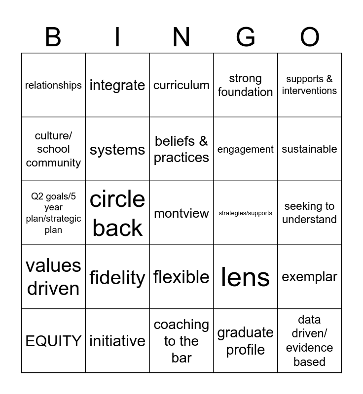 This bingo card has a free space and 39 words: MTSS, outcomes, lost in the sauce, systems, EQUITY, flexible, beliefs & practices, collaborate, supports & interventions, values driven, circle back, strong foundation, data driven/ evidence based, seeking to understand, strategies/supports, fidelity, exceptional learners, relationships, capacity/ infrastructure, lens, culture/ school community, coaching to the bar, engagement, sustainable, context, implementation, proactive, restorative practices, framework, integrate, grit/ resilience/ perseverance/(write in), CMAS, curriculum, initiative, graduate profile, college readiness, exemplar, Q2 goals/5 year plan/strategic plan and proximity.