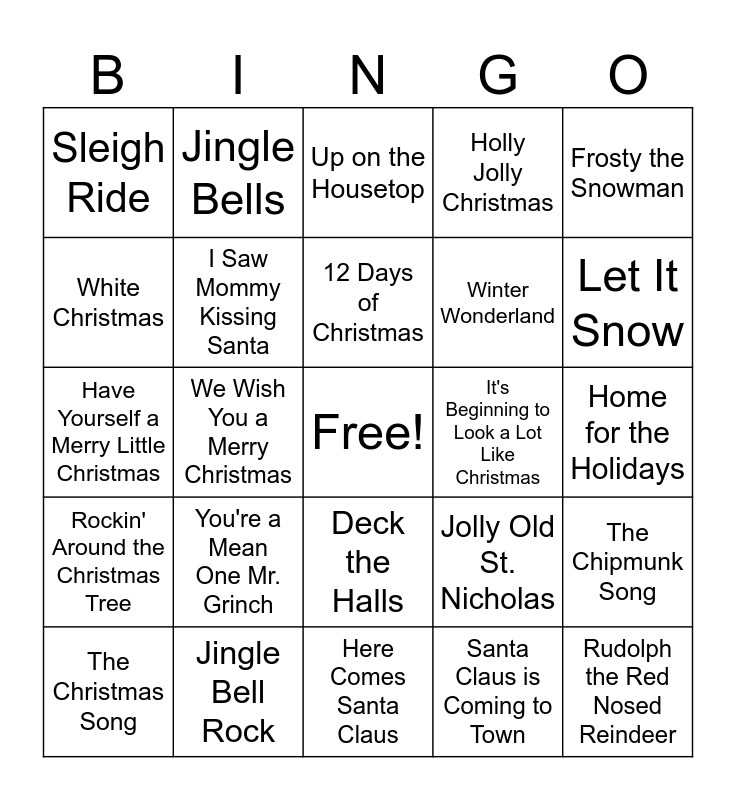 This bingo card has a free space and 24 words: You're a Mean One Mr. Grinch, Jingle Bell Rock, 12 Days of Christmas, The Christmas Song, Frosty the Snowman, Sleigh Ride, White Christmas, Jingle Bells, It's Beginning to Look a Lot Like Christmas, Deck the Halls, Winter Wonderland, Have Yourself a Merry Little Christmas, Jolly Old St. Nicholas, The Chipmunk Song, I Saw Mommy Kissing Santa, Santa Claus is Coming to Town, Home for the Holidays, Up on the Housetop, Let It Snow, We Wish You a Merry Christmas, Rudolph the Red Nosed Reindeer, Rockin' Around the Christmas Tree, Holly Jolly Christmas and Here Comes Santa Claus.