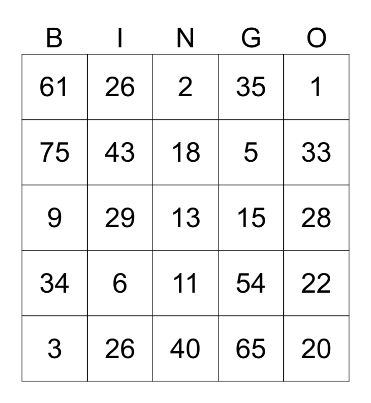 This bingo card has a free space and 24 words: 6, 26, 18, 3, 1, 61, 75, 26, 15, 11, 5, 9, 54, 22, 43, 65, 28, 2, 33, 29, 20, 34, 35 and 40.