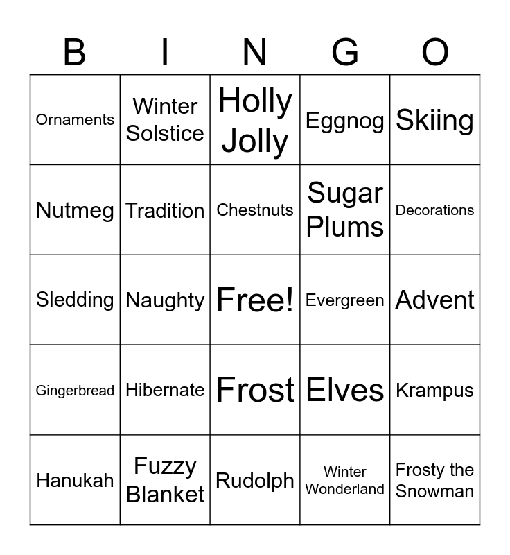 This bingo card has a free space and 45 words: Santa, Frosty the Snowman, Snow, Hanukah, Menorah, Winter Wonderland, Holly Jolly, Wreath, Skiing, Fuzzy Blanket, Eggnog, Evergreen, Frost, Hibernate, Jack Frost, Rudolph, New Year, Sledding, Snowball, Decorations, Winter Solstice, Vacation, Icicle, Ornaments, Blizzard, Advent, Caroling, Dreidel, Elves, Gingerbread, Grinch, Krampus, Kwanzaa, Latkes, Mistletoe, Naughty, Poinsettia, Wassail, Stocking, Chestnuts, Nutmeg, Sugar Plums, Holiday Cheer, Tradition and Yultetide.
