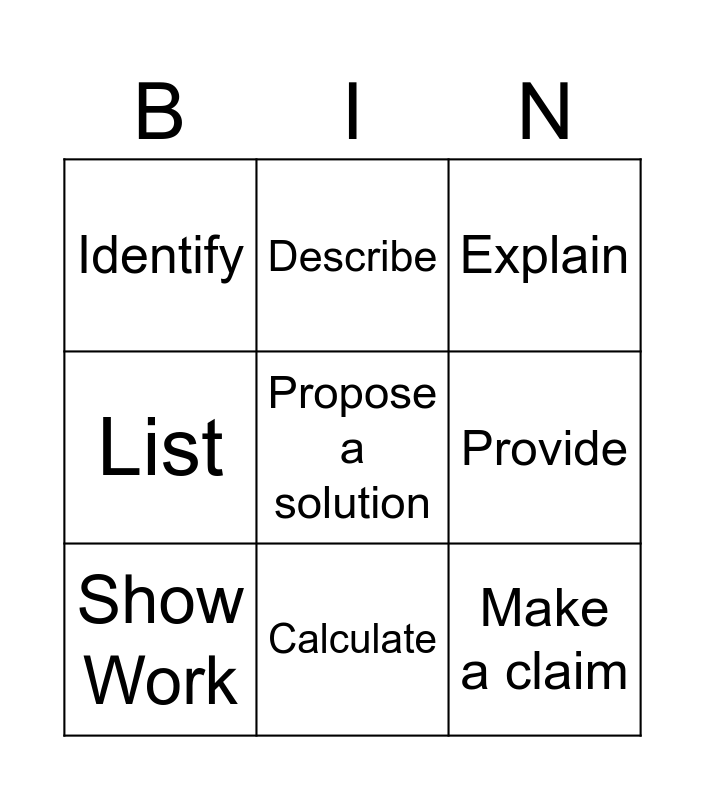 This bingo card has 10 words: Calculate, Explain, Identify, Propose a solution, List, Show Work, Describe, Justify, Provide and Make a claim.